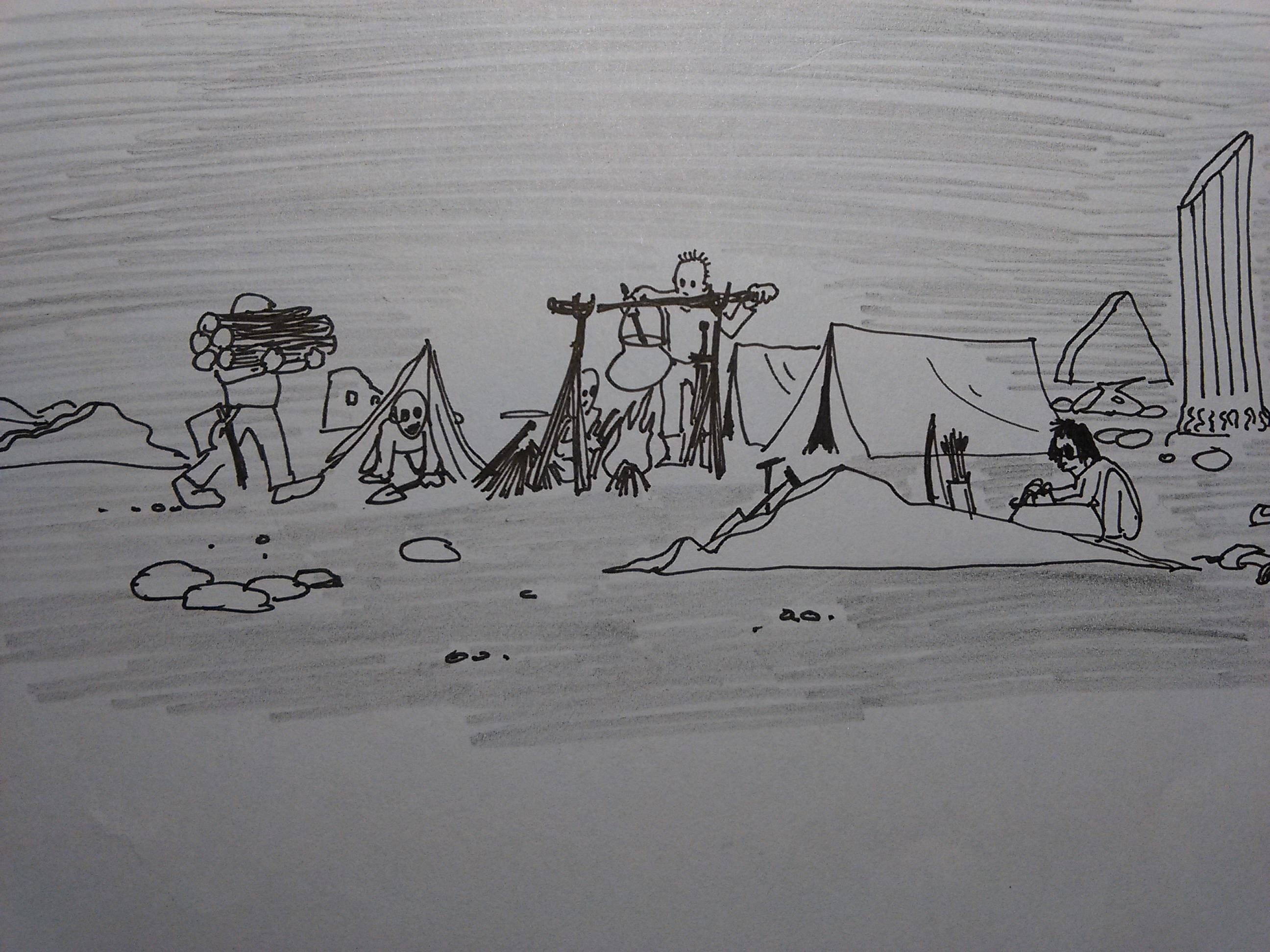 They soon find fallen trees and spy a group of adventurers with shovels and tents busy preparing their nightmeal over a fresh fire.