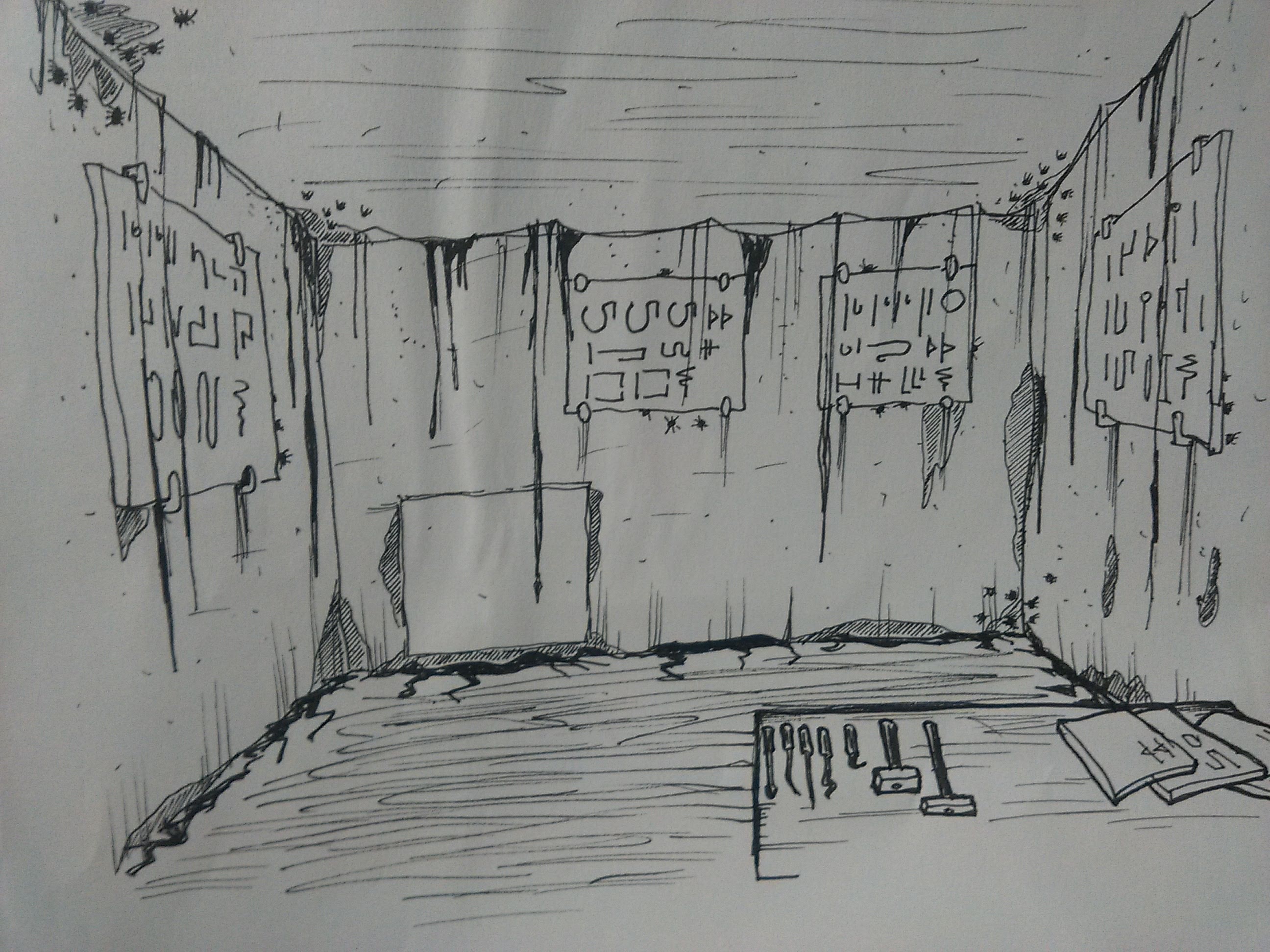 Ursula reacts quickly. She throws in a good handful of caltrops to buy some time, then removes the torch from the entrance to cast her traps in shadows. But Harmony fears this will not be enough. She summons the arcane energies and speaks the words of her spell: “Thunder touch”. With one hand she reaches in and feels the rough texture of the wall.