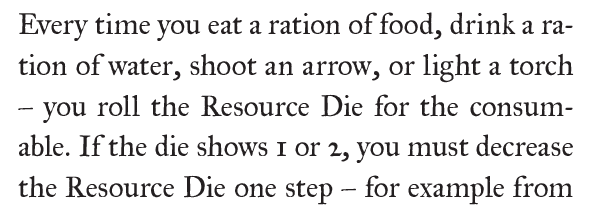 The system employs the Resource Die, like Macchiato Monsters or The Black Hack; however, in those systems the idea of the Resource Die is to reduce bookkeeping: You have Rd8 arrows. After a fight you roll a d8, and if it is 3+, you still have Rd8 arrows left. If it is 1 or 2, you have lost enough arrows to go down to a Rd6.