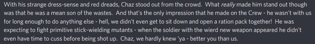 She felled the weaker-looking one first, then slashed at the strong guy. Losing his friend and feeling the hurt made him reconsider the attack, and he jumped back up onto the roof with an impressive bound, and fled, croaking. Snips took the dead mutant and dragged him back around the corner, out of sight, to the group.