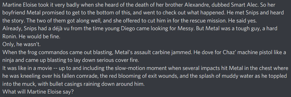 A hard battle ensued. Metal rolled over to the fallen Chaz and took his machine pistol, sprayed the frogs with bullets, but then got hit as he stood there over the fallen retainer: Metal fell right beside him, red blood blooming the shallow water. Snips took one frog commando out, then a second one, while the auto-shotgun peppered the clouds with blunt ammo, missing every time.