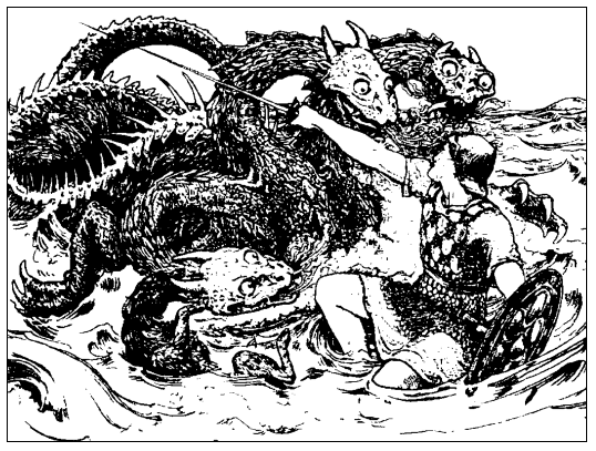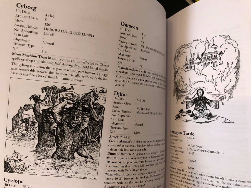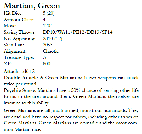 The spells are the same as in Original Dungeons & Dragons Single Version, with a slight re-wording here and there, and the monsters are too, although to be more complete, Goblin King, Hobgoblin King etc are entries separate from Goblin and Hobgoblin, with their own description, and Triceratops, Stegosaurus and Tyrannosaurus Rex, and various Martians á la Carter are added, so as to more completely reflect the wild atmosphere of mixing literary sources and genres that was part of the spirit of Old School.