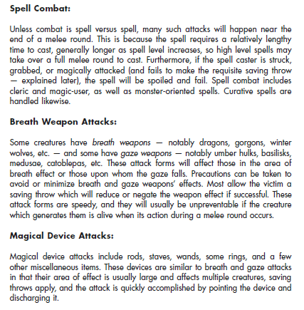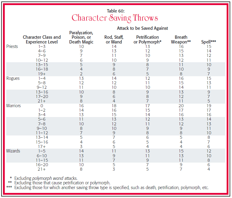 Faithful in the facts, even down to the footnotes! But everthing is easier to find. Even the detailed explanation of the saves is all in the same book and right after the table. We see why some people question 2e’s validity as an OSR game. It makes things too easy, almost like the Basic games, nay, even more so, as 2e introduces modifiers that make saving easier under the right circumstances. [but let’s be fair: also harder in less than ideal situations!]