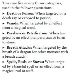 How to use them: Rather simple. If you get hit by something dreadful, you usually can have a saving throw, a last ditch escape from the negative impact. Not always, though! Sometimes a spell or a monster has it in the description that “no saving throw is possible”. In the end, the decision lies with the GM .. and that will often be necessary because the names of the saving throws vary from edition to edition, and they never quite seem to encompass any and all situations.