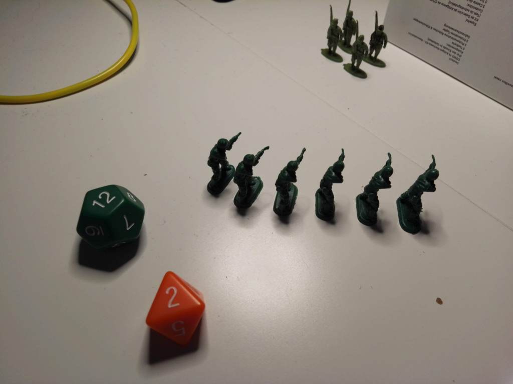 The d8 shows us a 2, the d12 shows a 12. Bad news for the rookies. The 12 goes through their hp of 2 AND through their STR of 8 like through wet tissue paper, and the guard unit is wiped out.