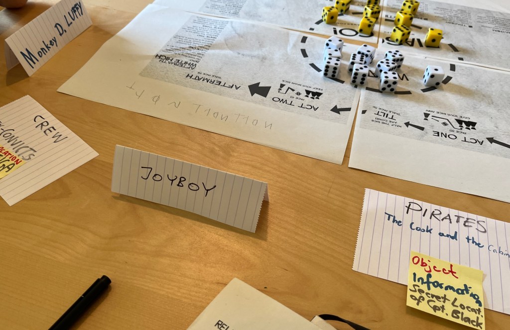 One of the players was a big fan of the popular manga/anime One Piece about a near-invulnerable pirate called Monkey D. Luffy, so he wanted to play that guy, but in fact the characters are not built with attributes or special powers, they are defined by their relations to the other characters, and scenes are not resolved with skill-rolls, but by the choice of die-colour.