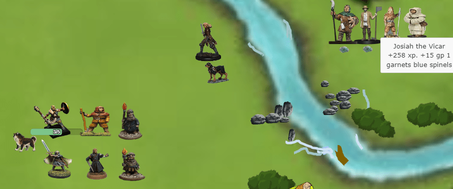 That was when arrows started to find their mark: The thief hit one of the archers, and an archer hit Gilead hard, laying him low at the river bank. Luckily, the Vicar was right behind him and quickly saved the downed swordsman.