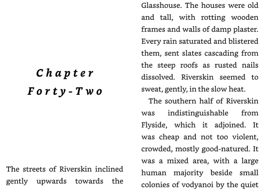 Miéville’s writing comes in a style that feeds the reader’s mind through detailed yet varied descriptions which paint in broad strokes and leave gaps for the reader’s mind to fill. The author’s vocabulary is vast, and he makes use of it. He picks his verbs and adjectives with purpose. They tend to bring the unseen to life in a vivid fashion, and paint the atmosphere, sometimes underlying the soft and wobbly, at other times the hard, concrete and jarring.