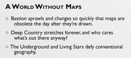 Pretty much like Electric Bastionland claims the city is supposed to look like: Ther is no map to lean on, because Bastion is different for everyone.