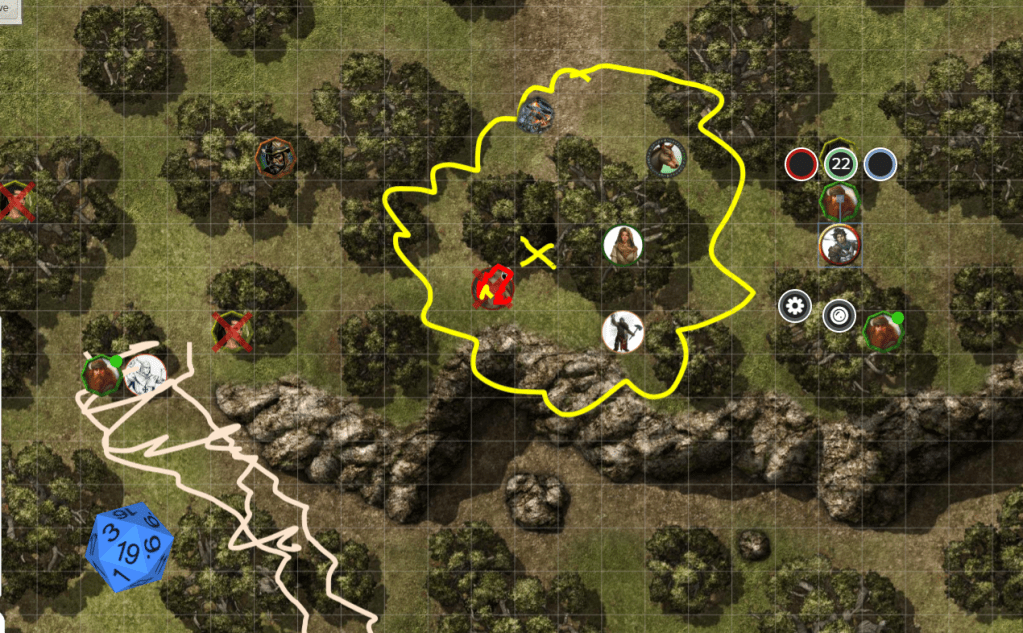 Just as the druids closed in. In the following struggle Matrius sniped another Druid archer, Aretain suffered a serious arrow wound while defending, and had to seek cover, teetering on the brink of 0 HP.