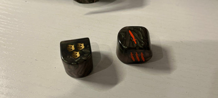 Third, there are two custom-made four-sided dice that do NOT work as caltrops.