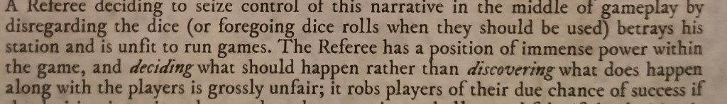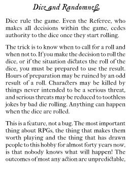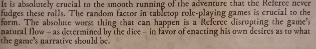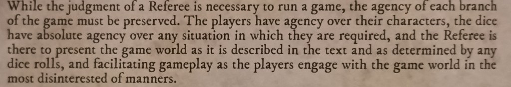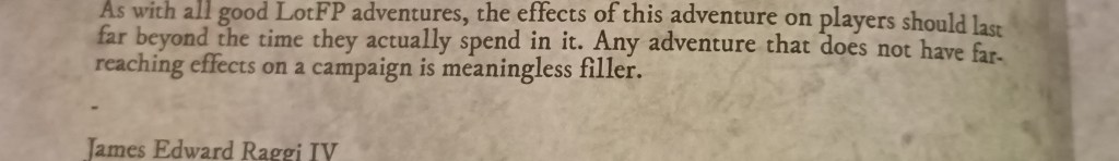 This randomization is no accident, and no copout, no avoiding prep-work. It is very deliberate. “Crucial to the form”, says James Raggi, and who would honestly challenge that? Diceless games exist, but they tend to be pretty dry.