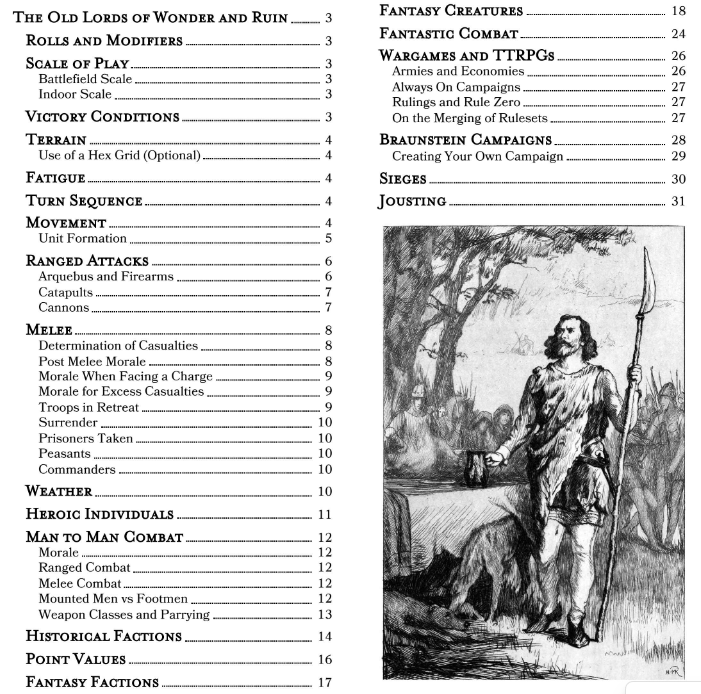 As an extra that is not present in Chainmail (how could it, given the Chronology?), Old Lords of Wonder and Ruin takes a moment to explain how the rules can seamlessly integrate with an RPG and can be adapted to various sizes from 100 or 20 men for a figure down to just 1 man versus another, and it explains Braunstein campaigns of warring polities led by players vying for political power.