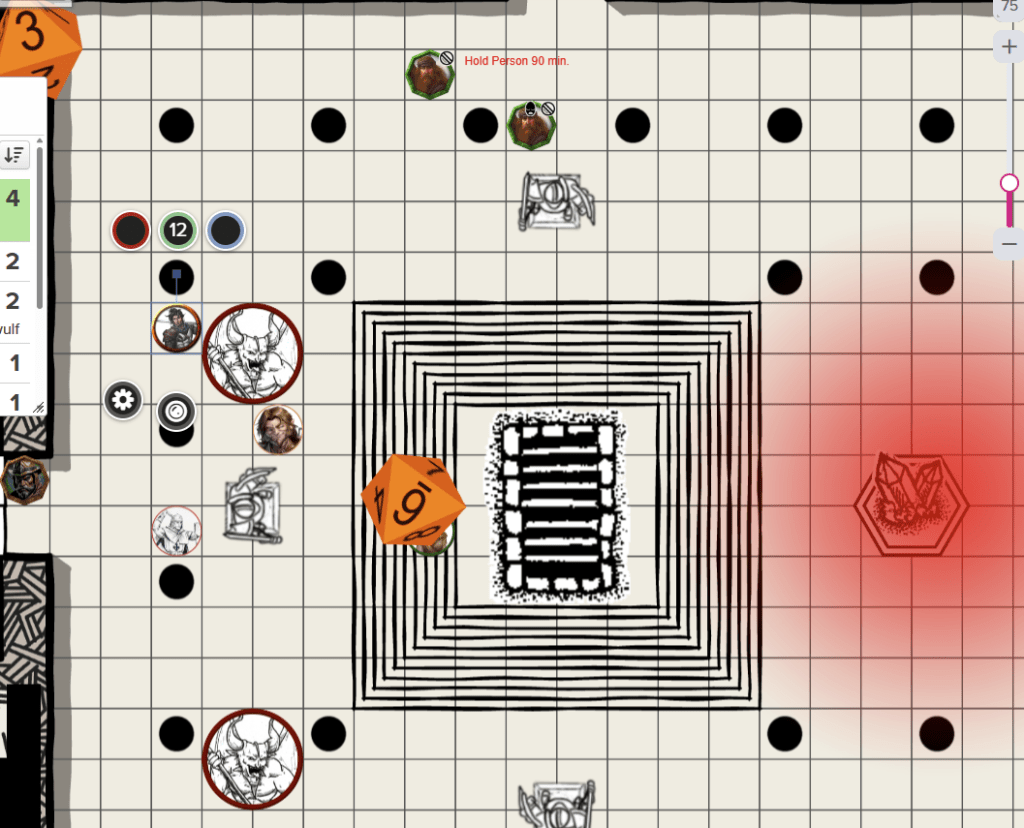 Two agitated blood druids rushed in from the north, alarmed by the sounds of stomping, snorting and growling. Aretain ducked between pillars and dwarf-statues and climbed the dais, and from there she cast Continual Light, blinding one of the druids. The southern Demon attempted to corner Apoqulis, who played hide and seek behind the pillars, but took a moment to cast a spell of Fear at Aretain – yet she resisted the effect. She in turn cast blindness on the demon, which he resisted in turn. Apoqulis capitalized on that breather to cast „Hold Person“ on the two blood druids, freezing them in their tracks for the next 90 minutes!