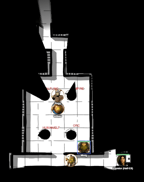 The party went into the room with the skulls on pedestals, and Minig spent a full turn staring them down and trying to figure out if they were triggers for some mechanism. There wer an orc skull, a skull of a human or elf, a skull of a halfling or child, and a weird fanged skull, potentially from a vampire. Minig dared not move them, convinced that they must be part of a deadly puzzle … alas, he could not figure it out.
