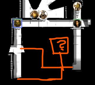 While the others waited around Farin to get command over his limbs back, Minig silently plodded forward into the area where the Ghouls had come from. He found a corridor bending back to the north beyond the area we knew — potentially leading to the locked zombie room from the south, just as the fly-room should from the north. He also encountered a grimy room saturated with the stench of decay, with a huge marble table on a filthy rug, and two oil paintings of a stern looking couple that seemed to watch the little intruder from their frames.