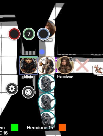 Neither Minig nor Hermione could get to the front line, had to wait things out. The third Ghoul bit Willem for 4 damage, but the stoic warrior took it in stride, succeeded in his save against paralyzation, and rolled a 19 on his own attack, shattering the undead fiend. The path was clear. Victory!